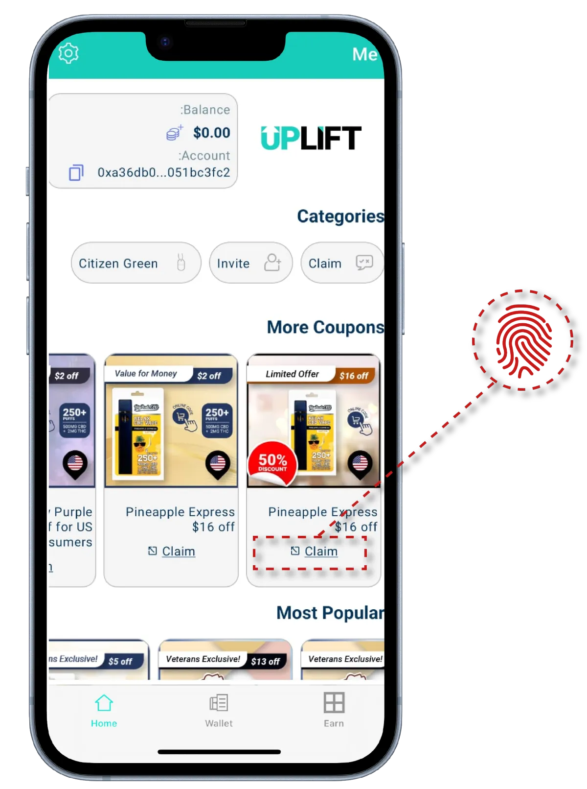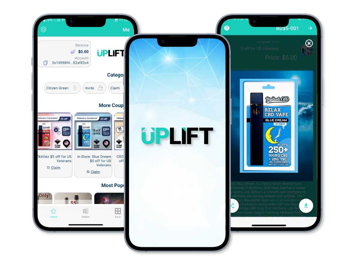 Simply download the Uplift app to access exclusive NFT coupons for CBD and Cannabis products and Citizen Green's dedicated interface, offering extra savings and deals exclusively for veterans. Start saving hassle-free on your purchases today!